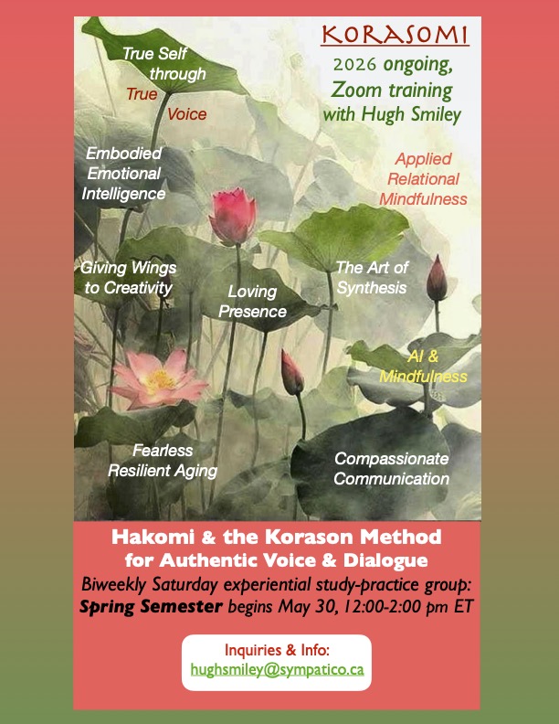 KORASOMI is a creative synthesis & mentoring of the Korason Method (KM) for Authentic Voice & Dialogue integrated with the Hakomi Method of somatic, mindfulness-based self-inquiry. All this, through experiential group process & practice in the science & art of becoming a full person.